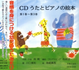 CD版は、ひと言で言えば「耳から入る教材」です。伴奏のアレンジは、様々な楽器音を使ってアンサンブルのように仕立て、絵本の物語が眼に浮かぶような音楽的イベントがたくさん入っています。CDを聴いてメロディーや歌詞、絵の雰囲気などに馴染んでいれば、実際のお稽古に目覚しい効果が現れます。『うたとピアノの絵本』の「まえがき」に「5~7歳の子供達は、鍵盤の上でドレミの位置を覚えて、楽譜を読みながらピアノや鍵盤ハーモニカで弾くことが出来ます。」とありますが、1~2才でこのCDを聴いていた子どもたちは、3~4才になる頃には楽譜を読まずに 聞こえてくる音から曲を自然に弾いてしまえる例が多く見られました。ここまでくると、鍵盤と楽譜から音の高さやリズムを結びつけるのはそう難しいものではありません。このことは教える側にとっては大いに助けになりますし、読譜やピアノに集中することにつながります。また伴奏に利用している様々なリズムや、聴き馴染んだメロディーは、ピアノを弾く時の音楽づくりにも十分活きてくるでしょう。
