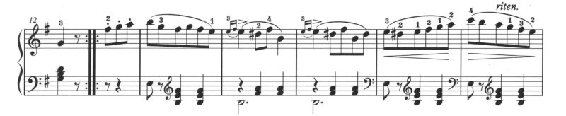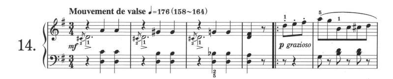 奥多部 デュナーミクは全体に控えめですよねぇ~、イントロもmfで、4 小節目の踊りの始まりもpでとてもお上品な感じ。12 小節目から調性が変わってmoll なのに、情熱的なのがステキだぉ。