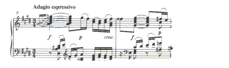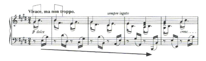 最初の2小節のソ#ミシという音が、3度と4度の形をつくり、左手は上行形になっています。第1楽章では、左手は下降形でした。
