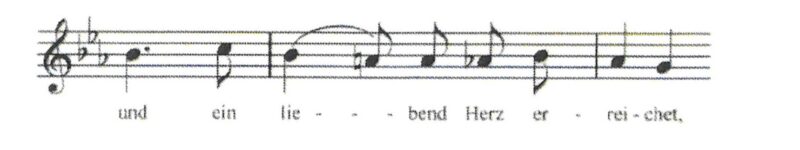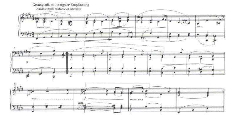 さて、第3楽章のテーマで特筆すべきはもう一点あります。それは、9小節目から12小節目。ここで歌曲集《遥かなる恋人に》のメロディーが使われているのです(譜例)。