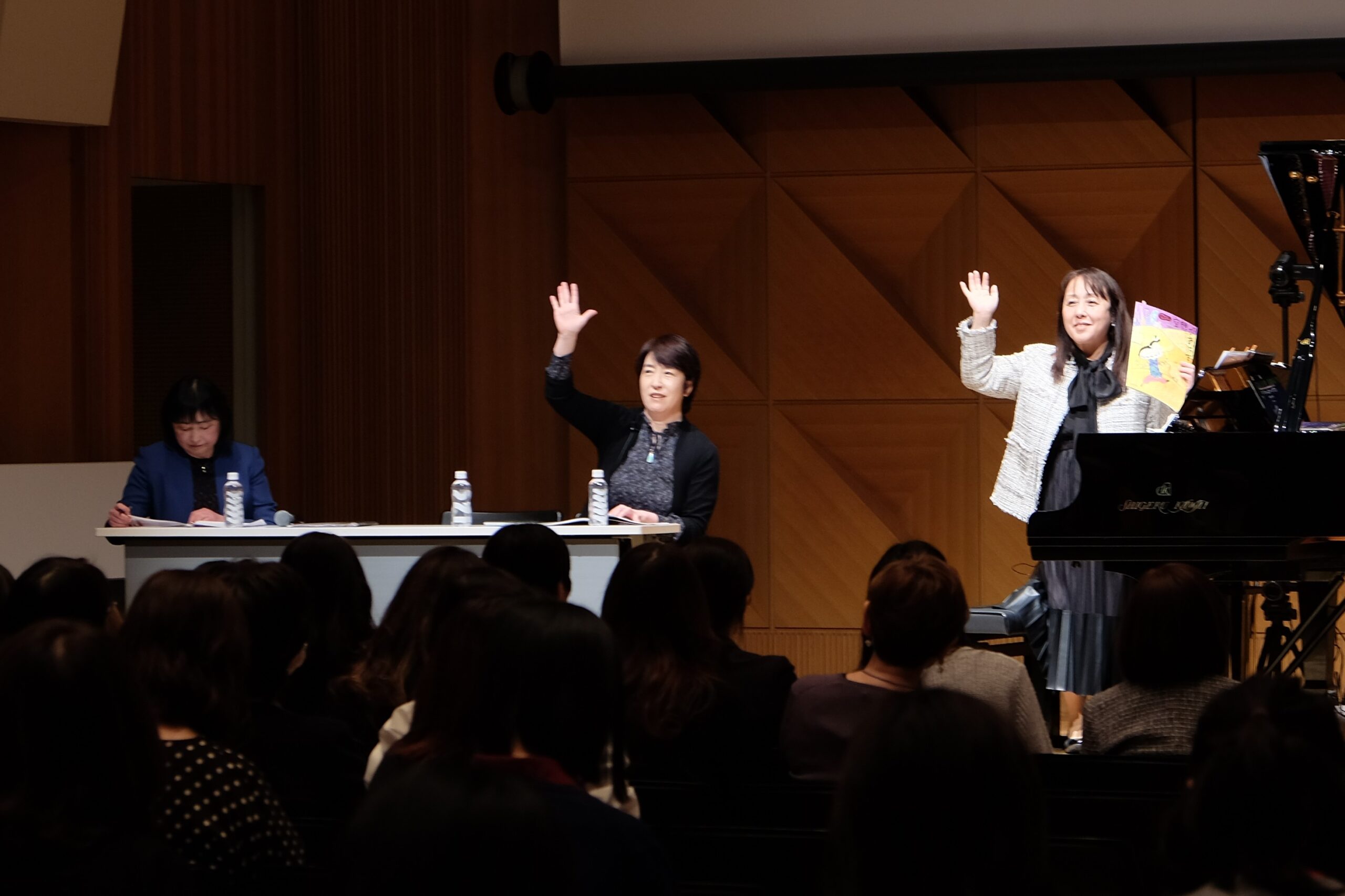 さらにこの日は「初めての試み」として、課題曲選定委員の本多昌子氏(委員長)、笹山美由紀氏、田中貴子氏が登壇し、「課題曲選定委員による選曲ポイント解説」が実演を交えて行われました。C級以下の課題曲では「音楽の基礎を楽しく学ぶこと」、D級以上では「より幅広い音楽に触れてレパートリーを広げること」が眼目になっているといいます。また、各曲の解説が「ピティナ・ピアノ曲事典」に掲載されています(課題曲選定委員による解説をまとめたページはこちら)。