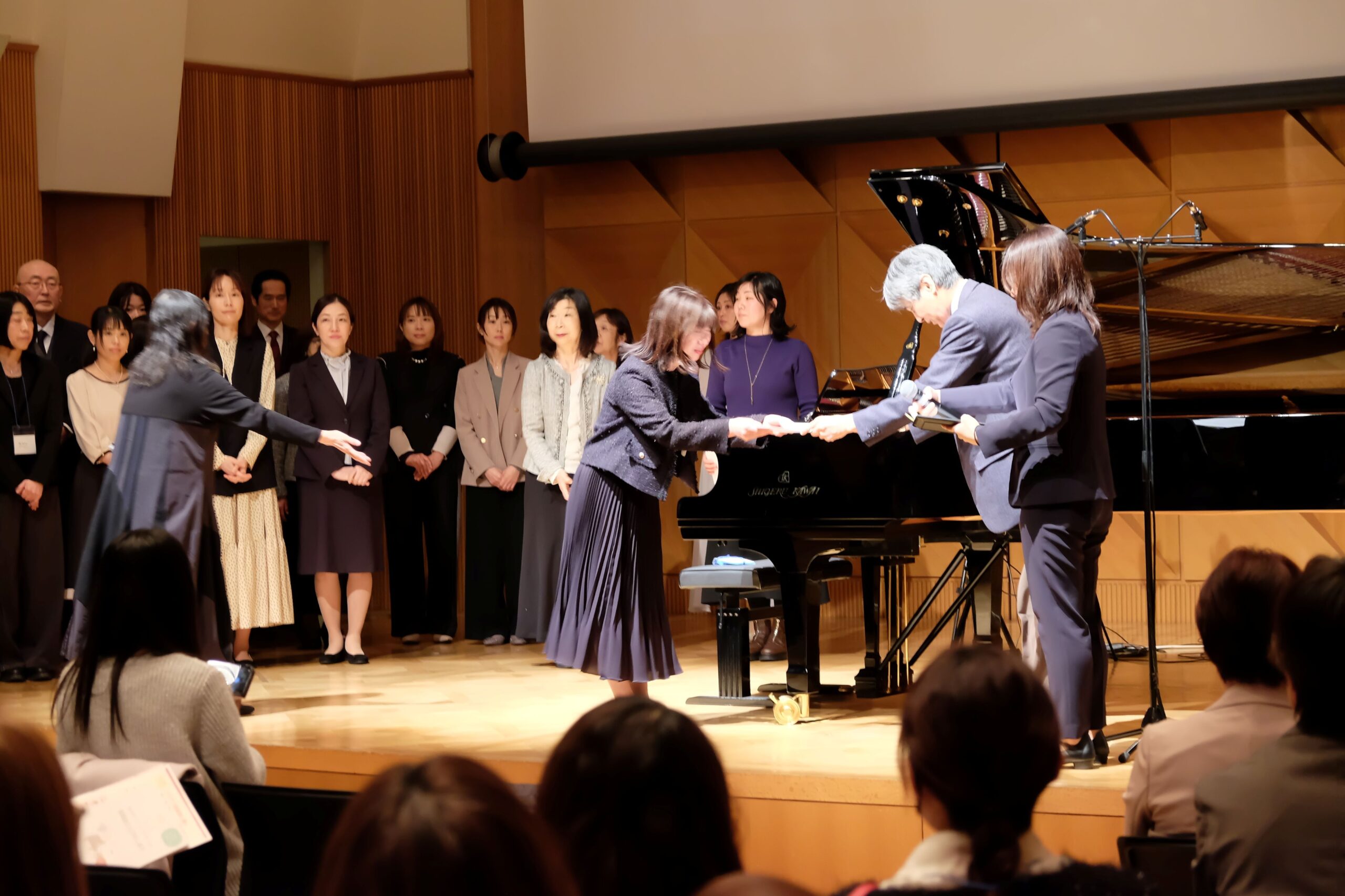 同コンペティションでは、「指導者の学び」も重要な要素として掲げられています。この日は、継続的な「指導力の研鑽」を支援する「ピティナ・ピアノ指導者ライセンス」の全級合格者授与式も実施。2025年度に「初級」「中級」「上級」のすべてのライセンスを取得した指導者がステージに上がり、合格証書を授与されました。
